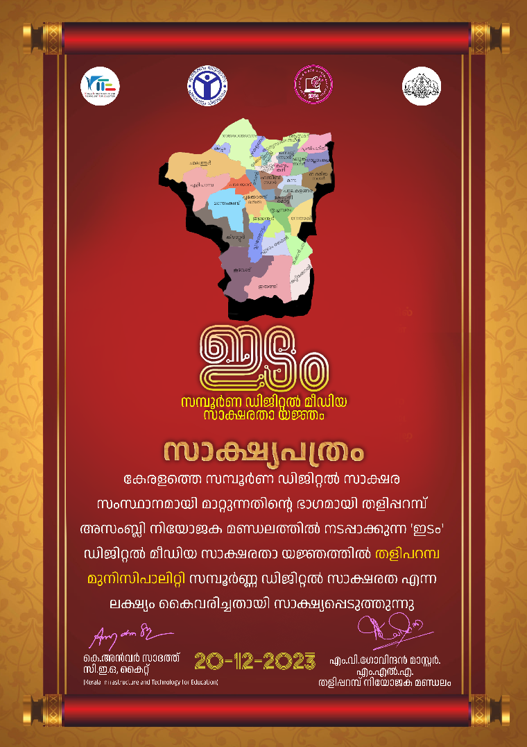 തളിപ്പറമ്പ് നഗര സഭയിലും സമ്പൂര്ണ ഡിജിറ്റല് സാക്ഷരതയുടെ പുതുനേട്ടം